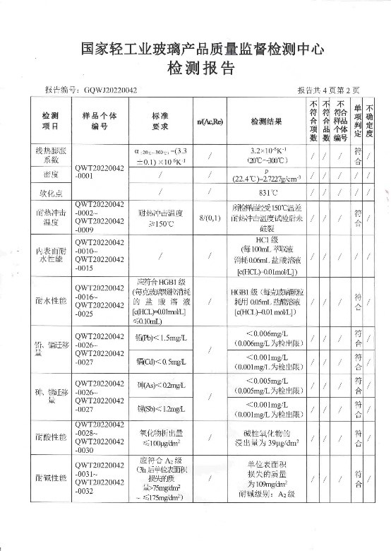 | Acid resistance | The amount of Basic oxide leaching ≤100μg/dm2 | The amount of Basic oxide leaching was 39μg/dm2 | Qualified |