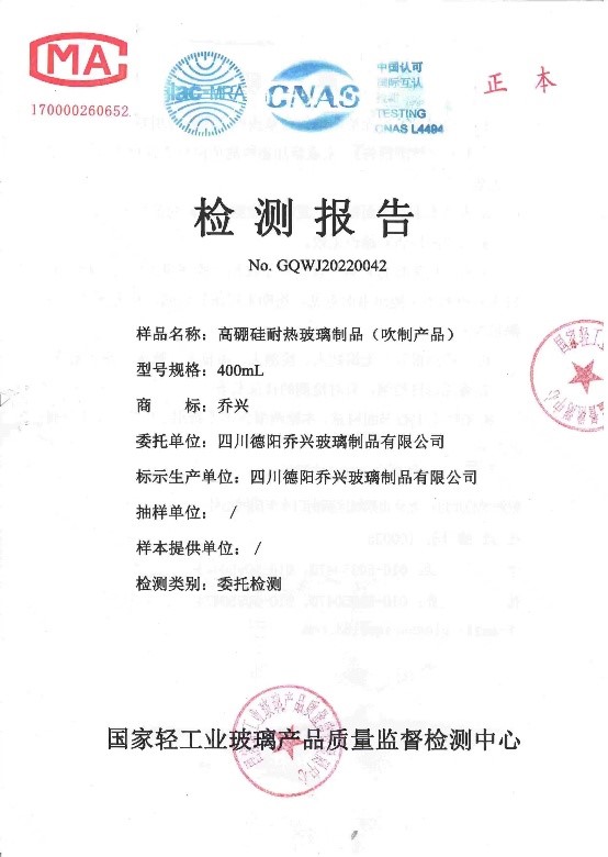 国家轻工业玻璃产品质量监督检测中心检测报告